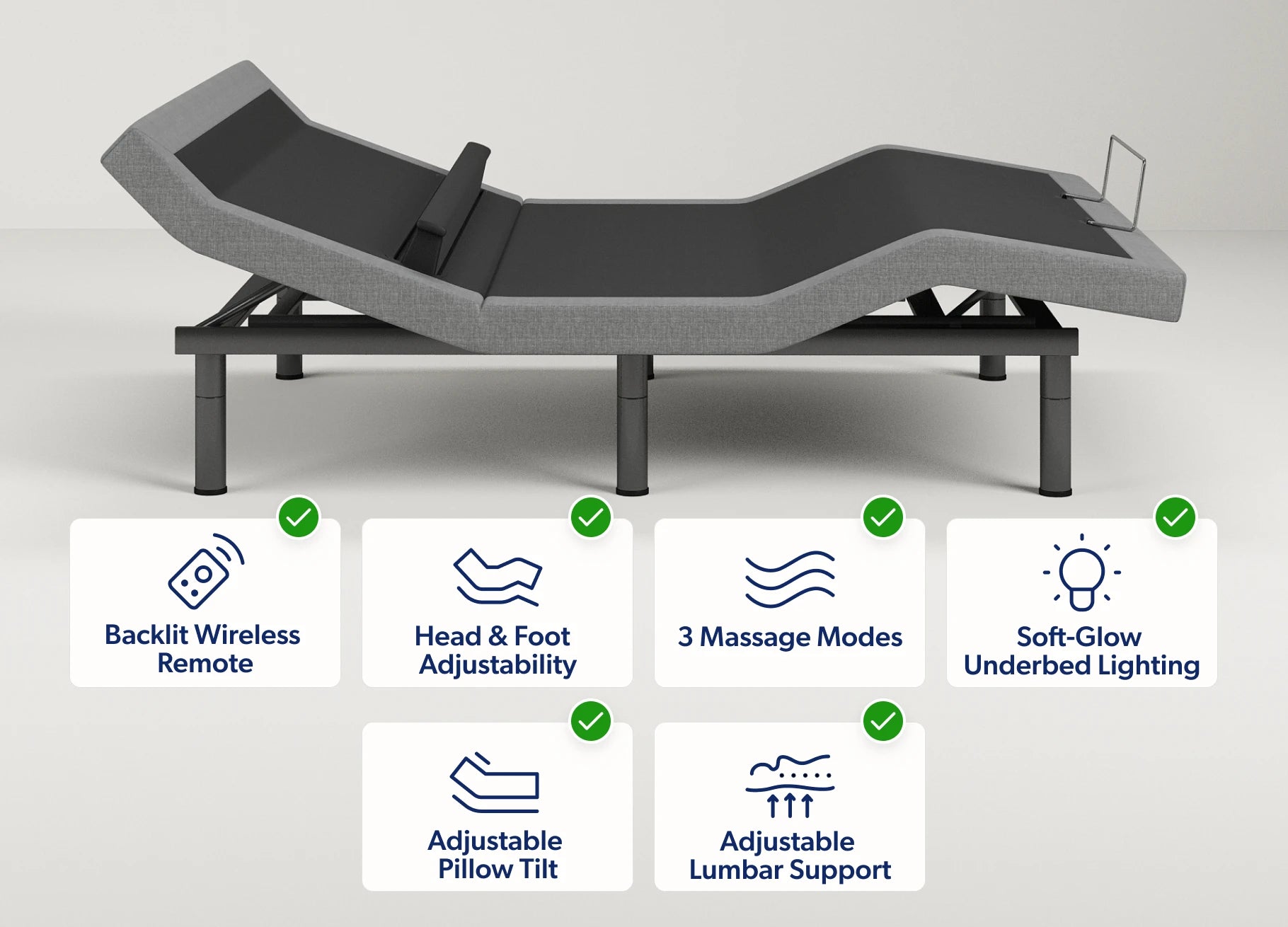 The 4.0 Pro Adjustable Base is built for those who want it all. Experience ultimate comfort with pillow tilt, adjustable lumbar support, full-body massage modes, and underbed lighting — all controlled by a backlit wireless remote. With heavy-duty lift power and customizable leg heights, it’s our most advanced base yet.