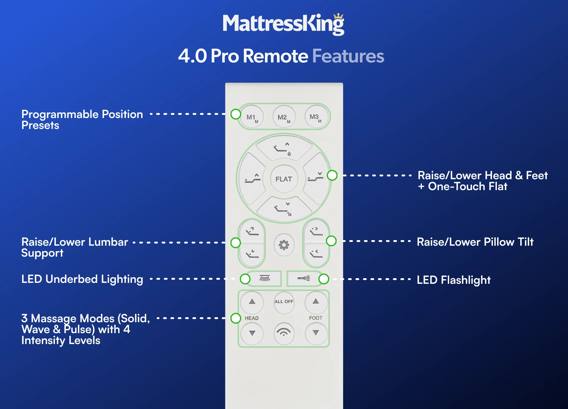 Navigate your comfort effortlessly with a sleek, wireless backlit remote. Save up to four of your favorite positions and adjust everything — from head to feet to pillow tilt and lumbar — with one-touch simplicity.