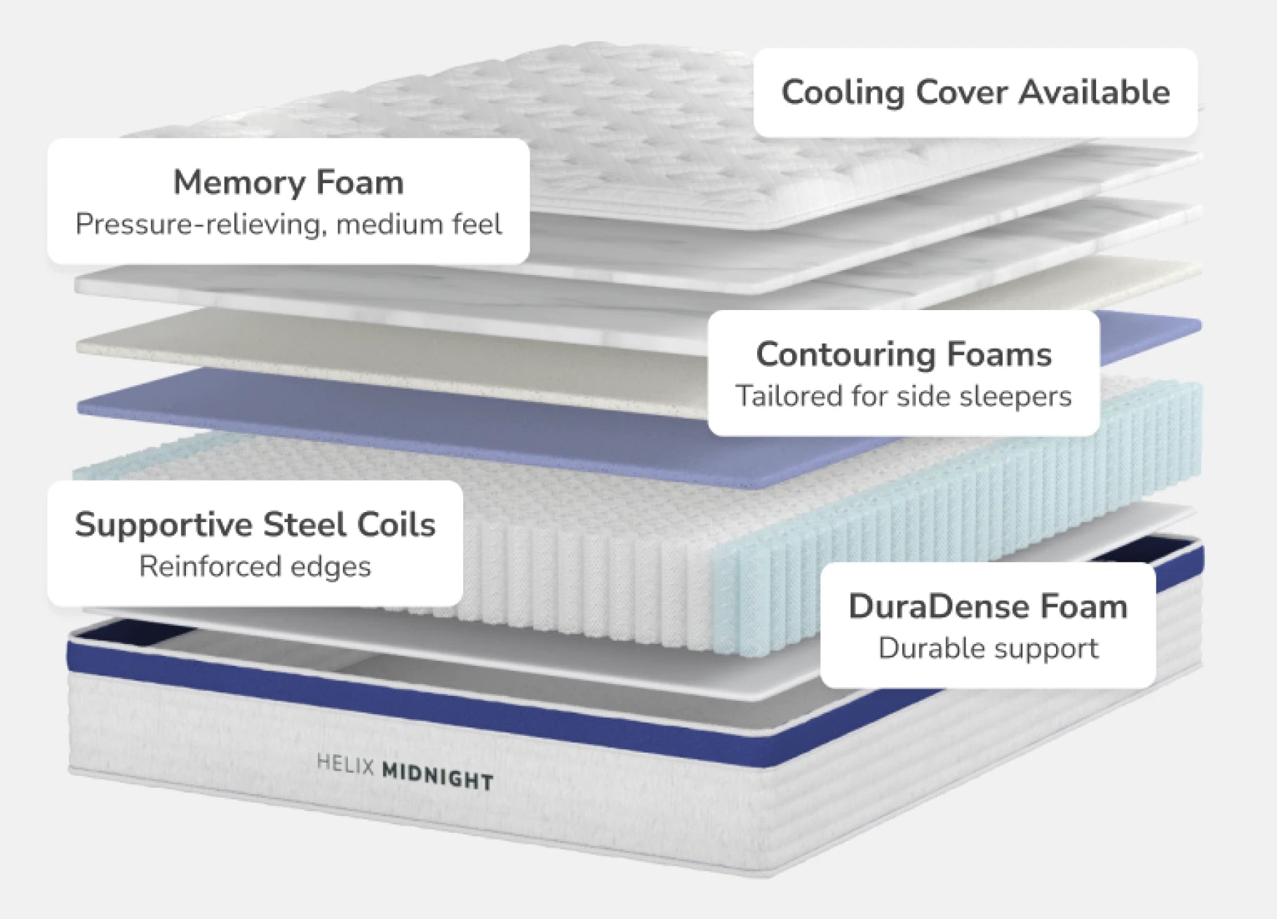 The Helix Core Midnight combines a cooling GlacioTex™ pillow-top with adaptive gel memory foam and responsive transition layers. Zoned for ergonomic alignment and topped with breathable design, this hybrid supports your body where needed and keeps you cool. Individually wrapped coils offer responsive support and excellent motion control, while reinforced edges extend usable sleeping area for stability and comfort.