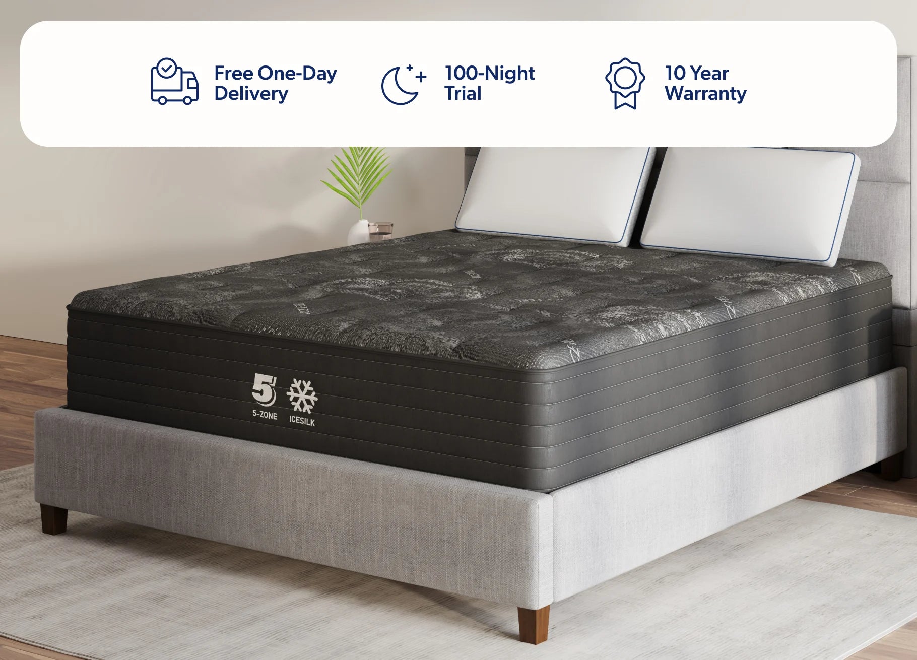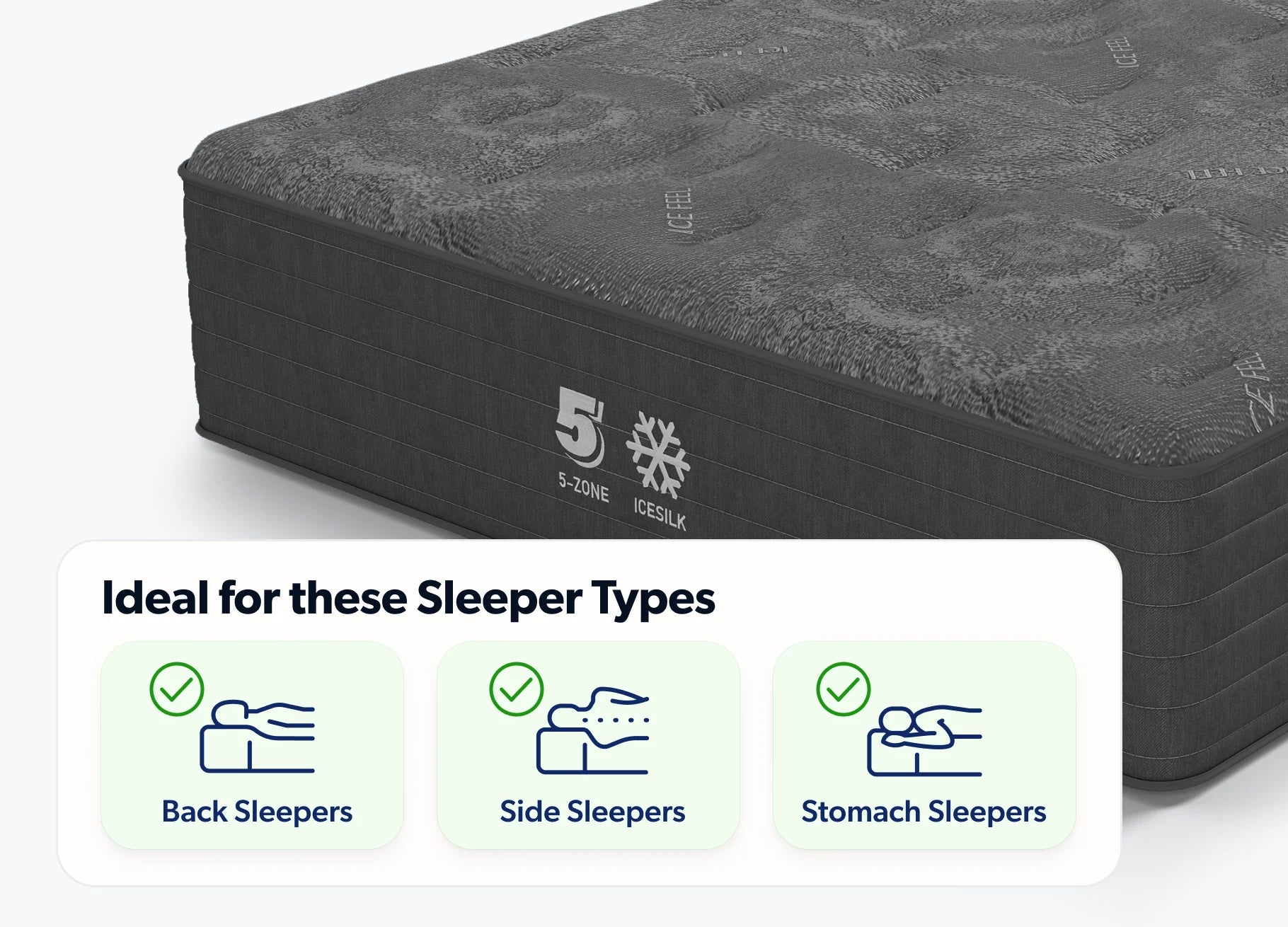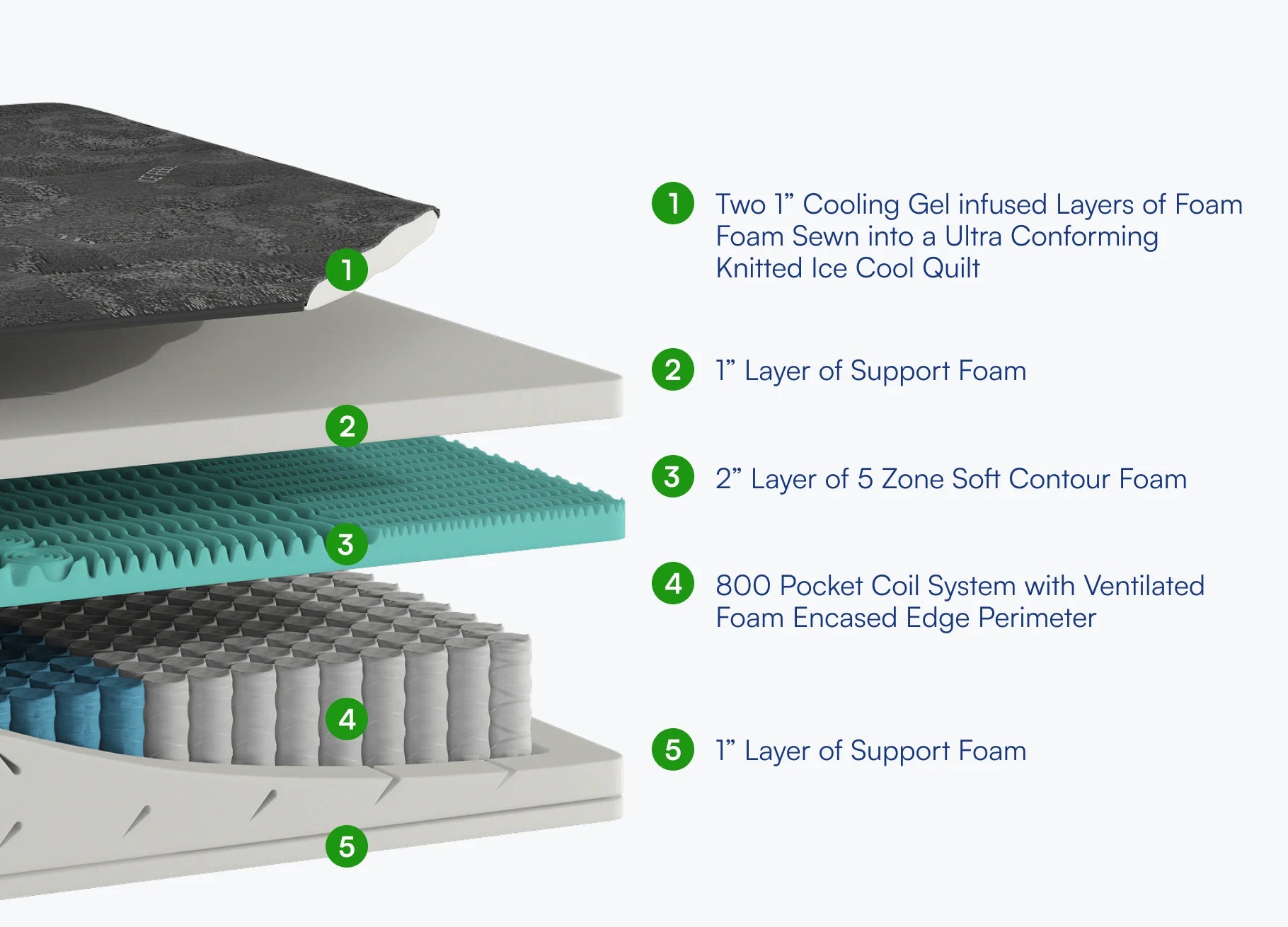 - Cooling Technology: Ice Cool™ quilted cover with gel-infused foams keeps your sleep surface temperature neutral.