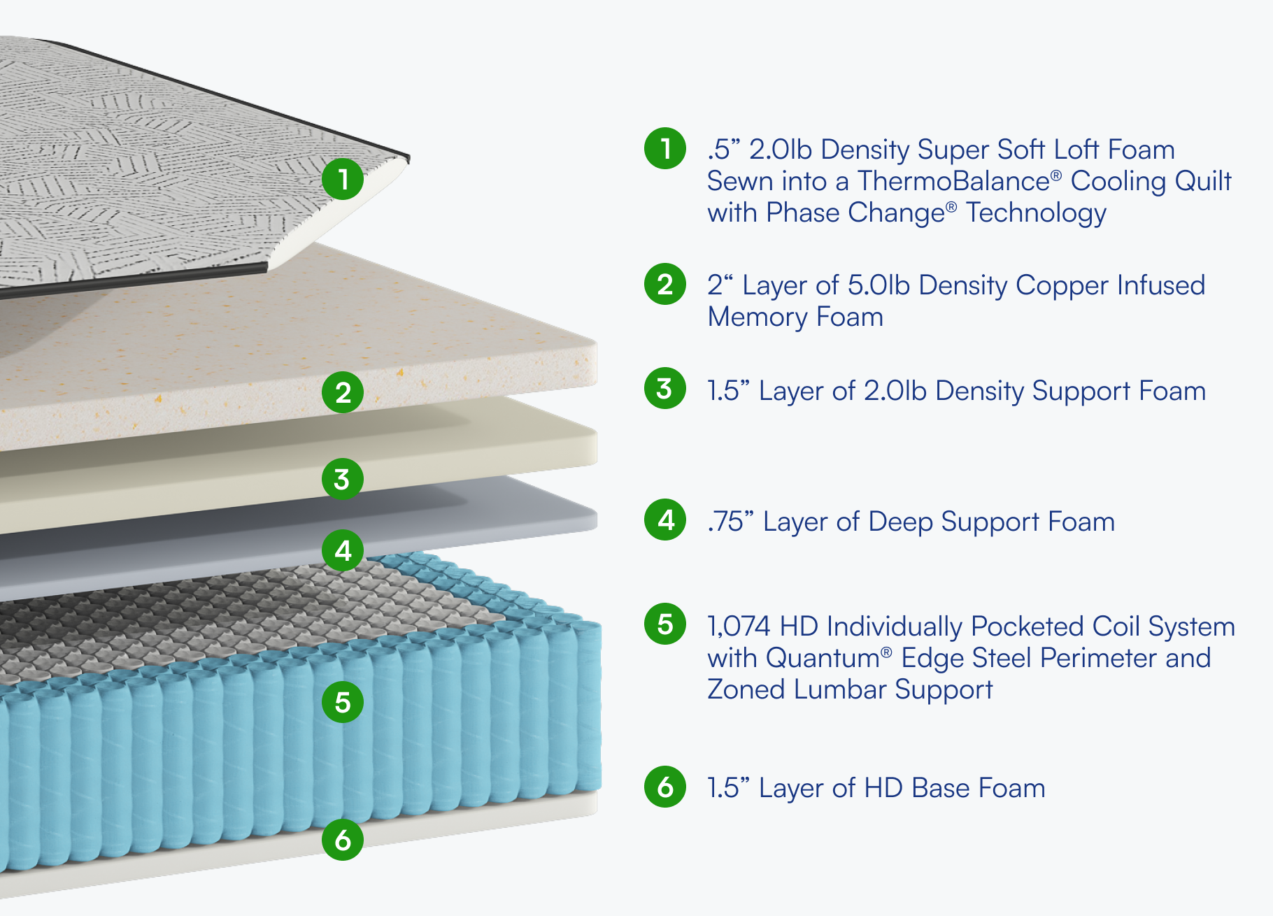 Experience unparalleled comfort with NXT 2000, a medium-firm mattress designed for ultimate support. It features a hypoallergenic, copper-infused memory foam layer, and advanced hybrid technology for superior lumbar support. The ThermoBalance® Cooling Quilt with Phase Change Technology, combined with a high-density pocketed coil system, ensures motion isolation and edge support. Ideal for those seeking a blend of firmness and comfort with enhanced cooling.