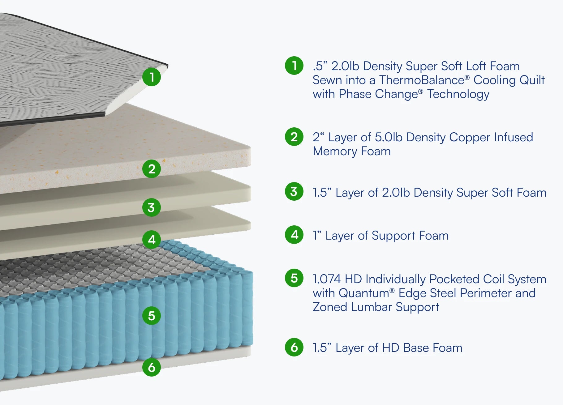 - Copper-Infused Gel Memory Foam for cooling + antimicrobial benefits